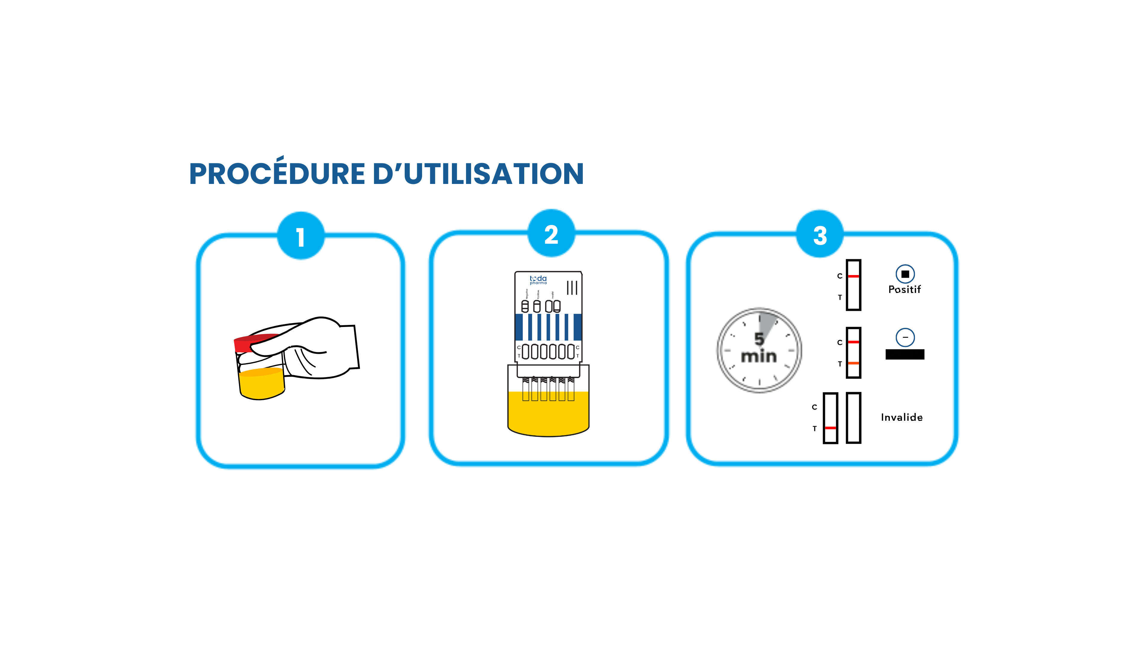 Les tests urinaires TODA Pharma Drugdiag® sont conçus pour une utilisation en une seule étape. Il vous suffit de prélever un échantillon d'urine sur le test et d'interpréter les résultats en seulement 3 minutes. Les procédures d'interprétation sont clairement indiquées sur le test, facilitant l'utilisation pour tous les utilisateurs.